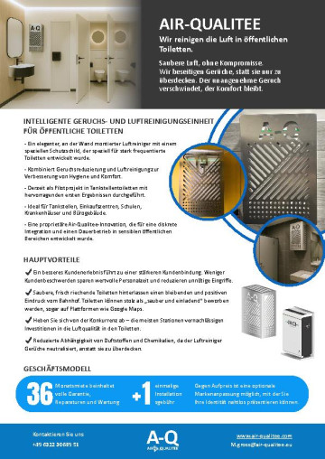 INTELLIGENTE GERUCHS- UND LUFTREINIGUNGSEINHEIT FÜR ÖFFENTLICHE TOILETTEN Gegen Aufpreis ist eine optionale Markenanpassung möglich, mit der Sie Ihre Identität nahtlos präsentieren können.AIR-QUALITEE Saubere Luft, ohne Kompromisse. Wir beseitige...