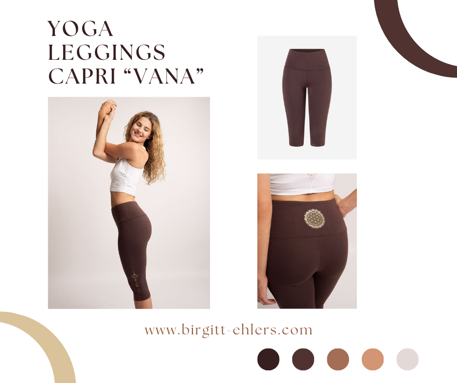 Die Yoga Leggings Capri „Vana“ vereint erdende Ruhe mit fließender Eleganz – für alle, die in ihrer Praxis bei sich ankommen und sich mit natürlicher Kraft verbinden möchten.