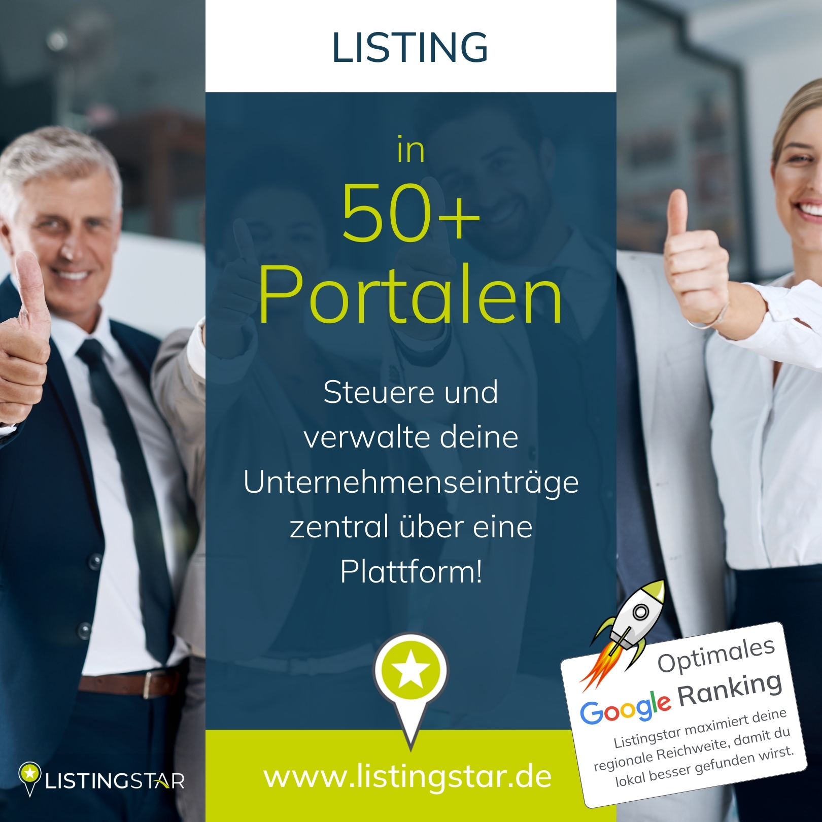 Mache jetzt mit Listingstar dein Unternehmen ONLINE & VOR ORT sichtbar - ein Schritt, der Großes bewirken kann! Stelle sicher, dass all deine Unternehmensdaten sicher und synchron sind. Die Einheitlichkeit und Aktualität deiner Daten sind der Schlüssel zu einem verbesserten Ranking auf Google, also lass uns gemeinsam den Weg zum Erfolg gehen!
